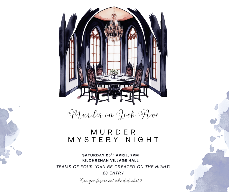 Join us at Kilchrenan Village Hall for a light-hearted murder mystery evening — a fun, sociable night with clues, conversation and plenty of laughs!