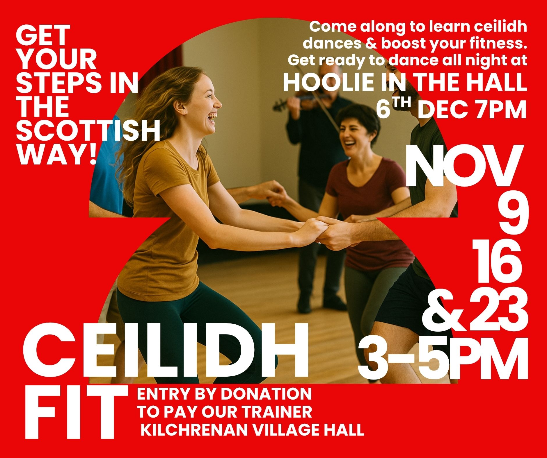 Ready to boost your fitness and learn some ceilidh moves? Join us for CEILIDH FIT – a fun series of dance sessions in the lead-up to Hoolie in the Hall on Saturday 6th December!